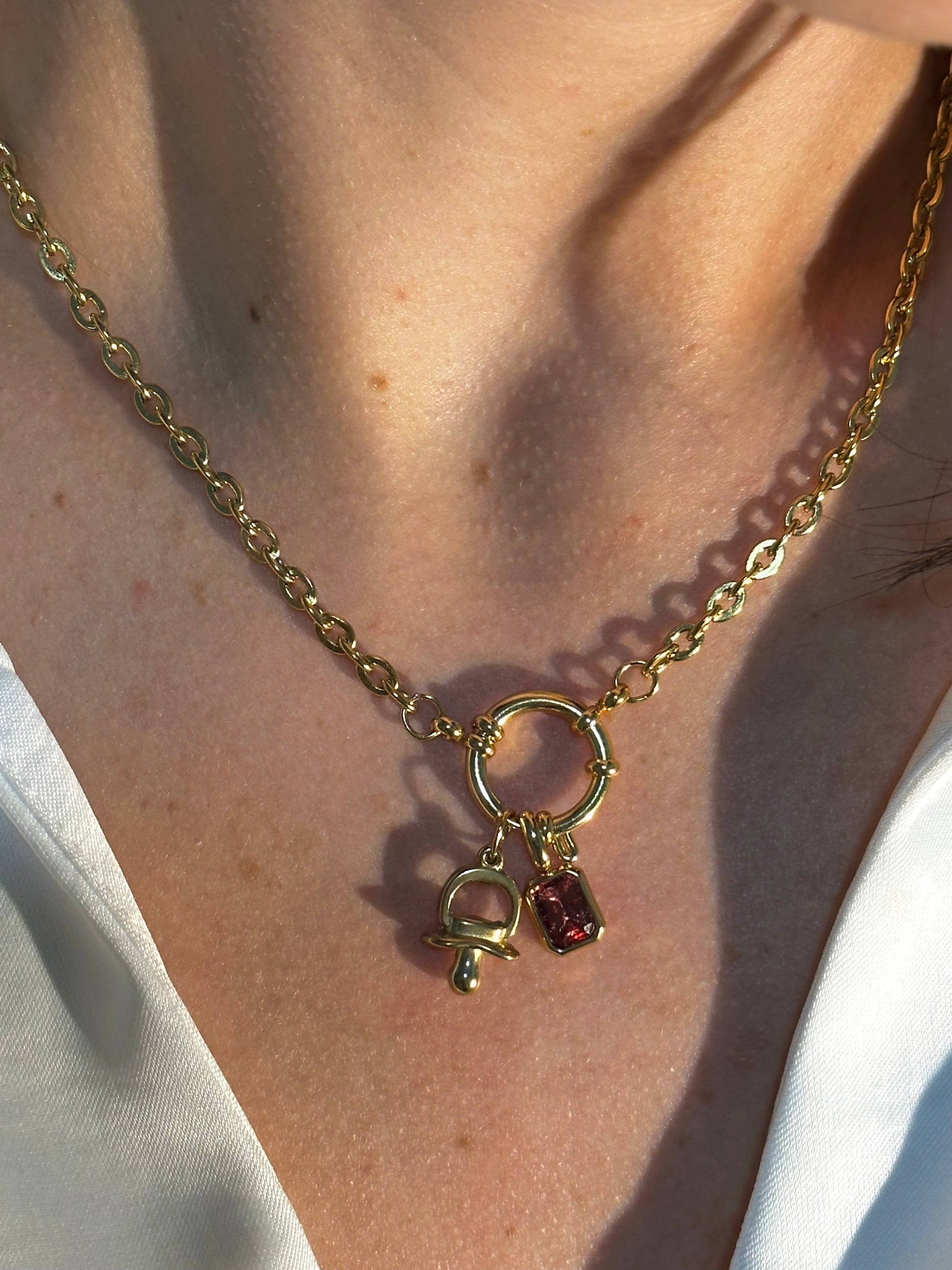Colgante de acero inoxidable bañado en oro de 18K para complementar tus cadenas con mucho significado. Cadena no incluida.