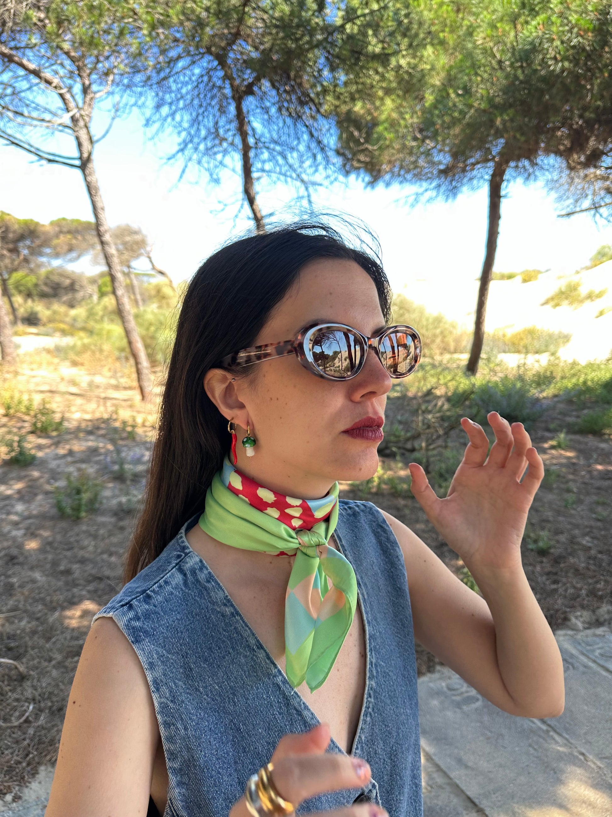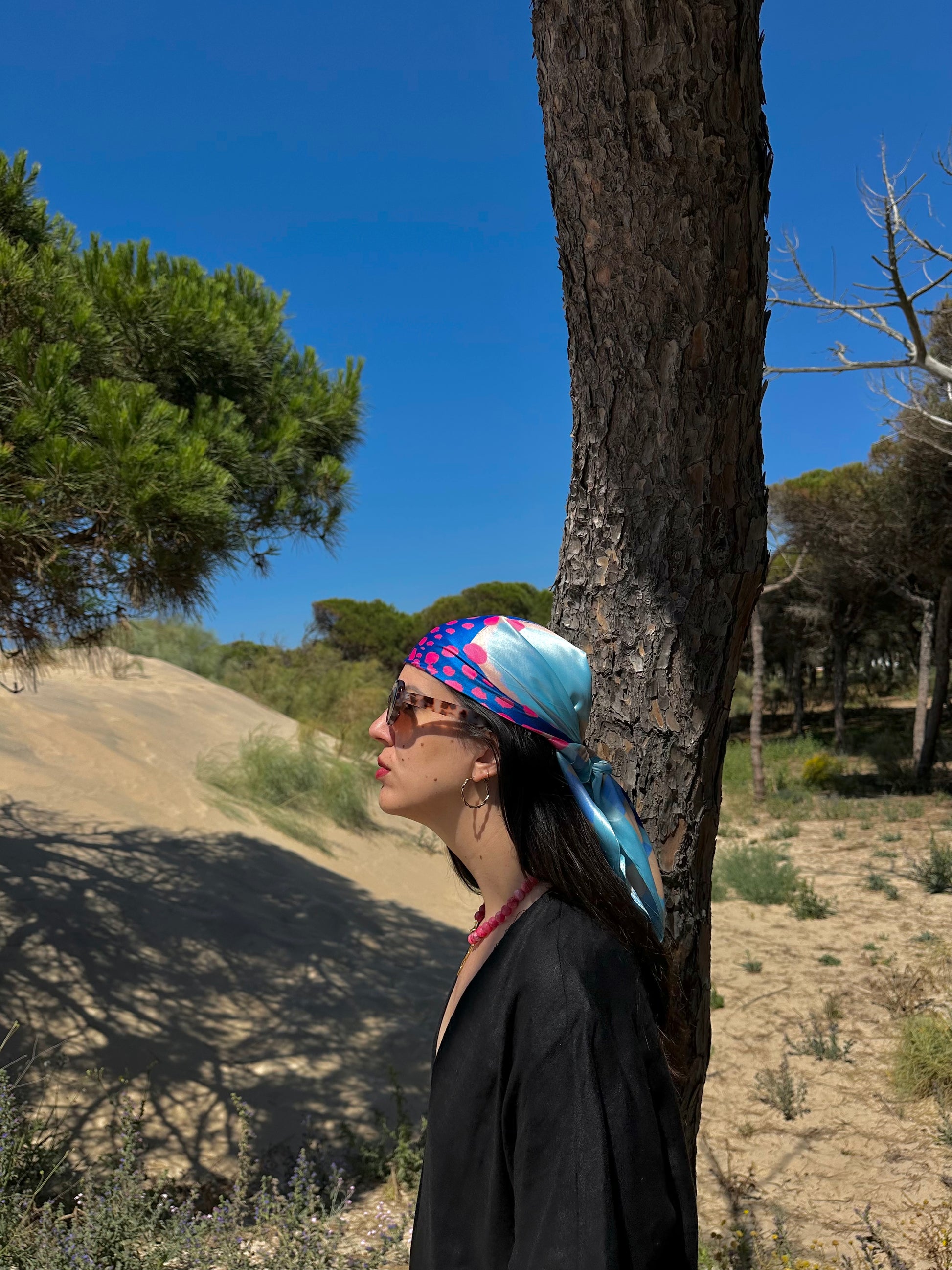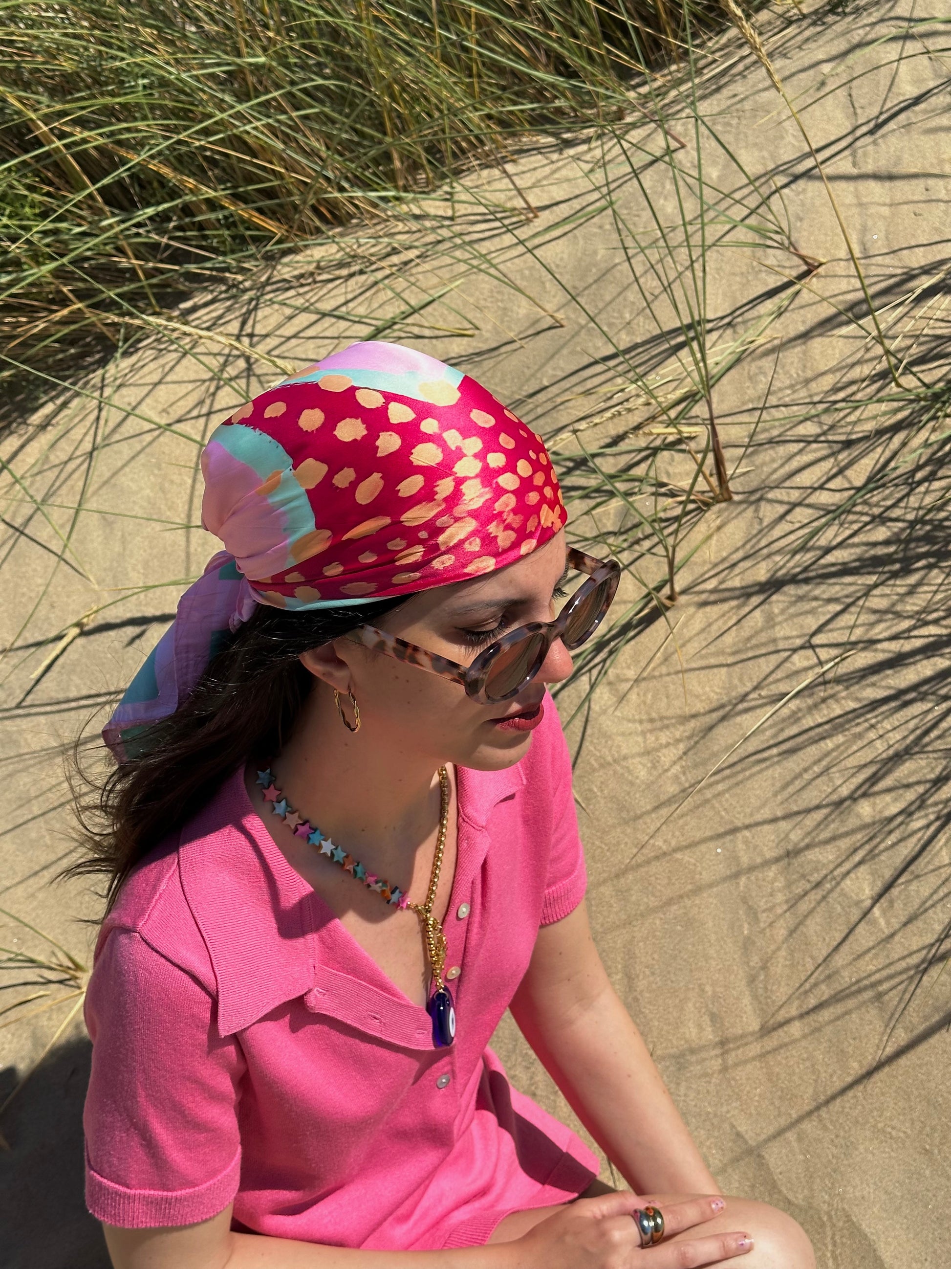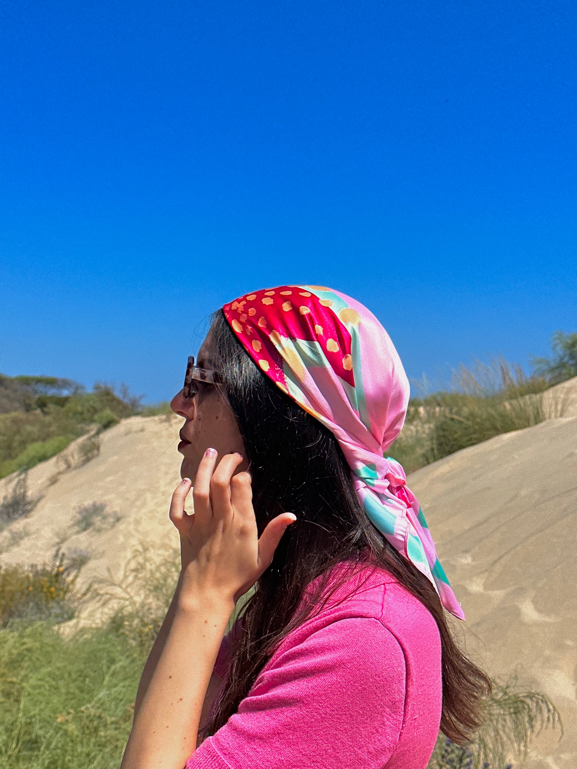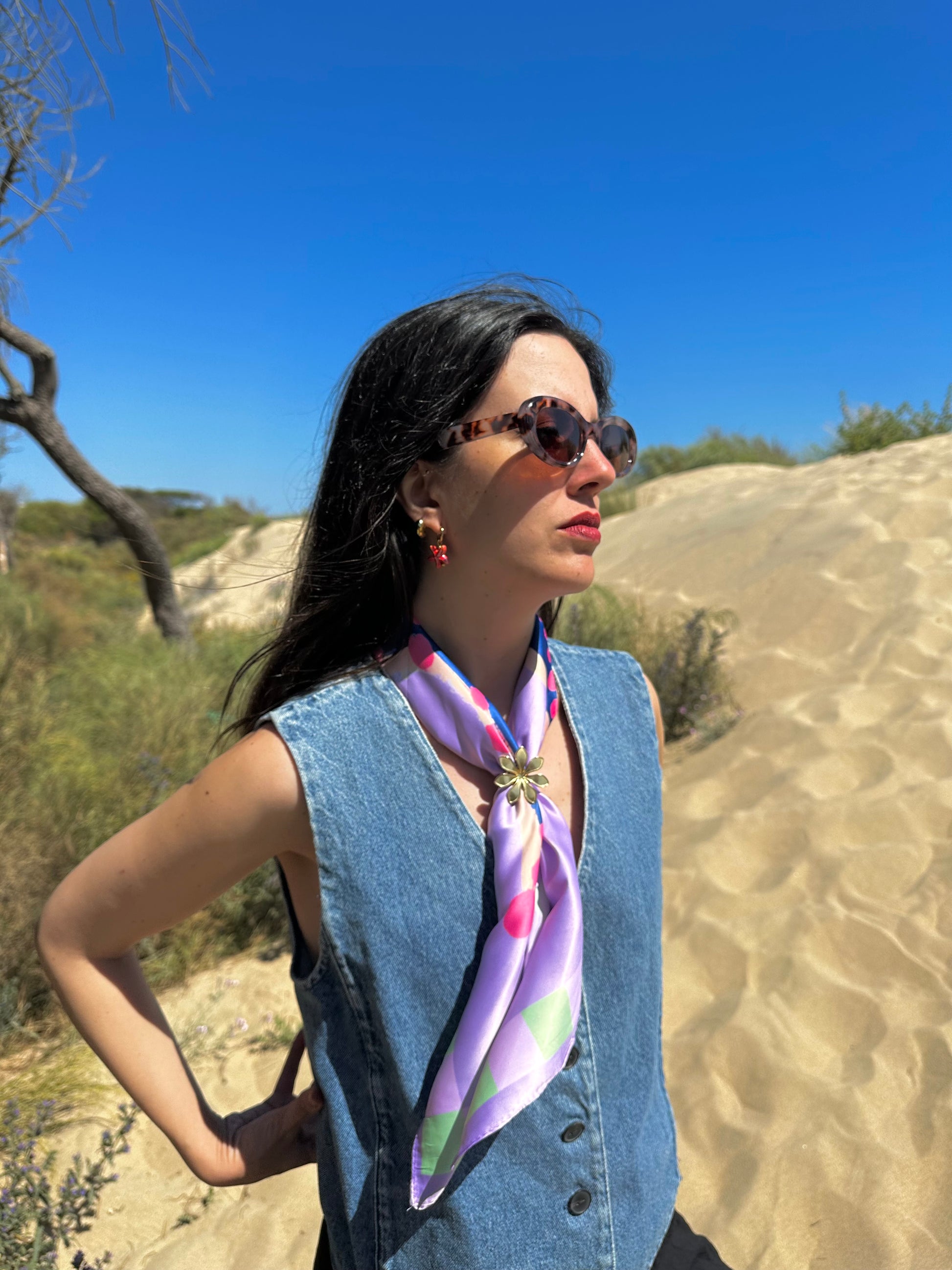 Pañuelo de seda estampado disponible en cuatro colores diferentes.