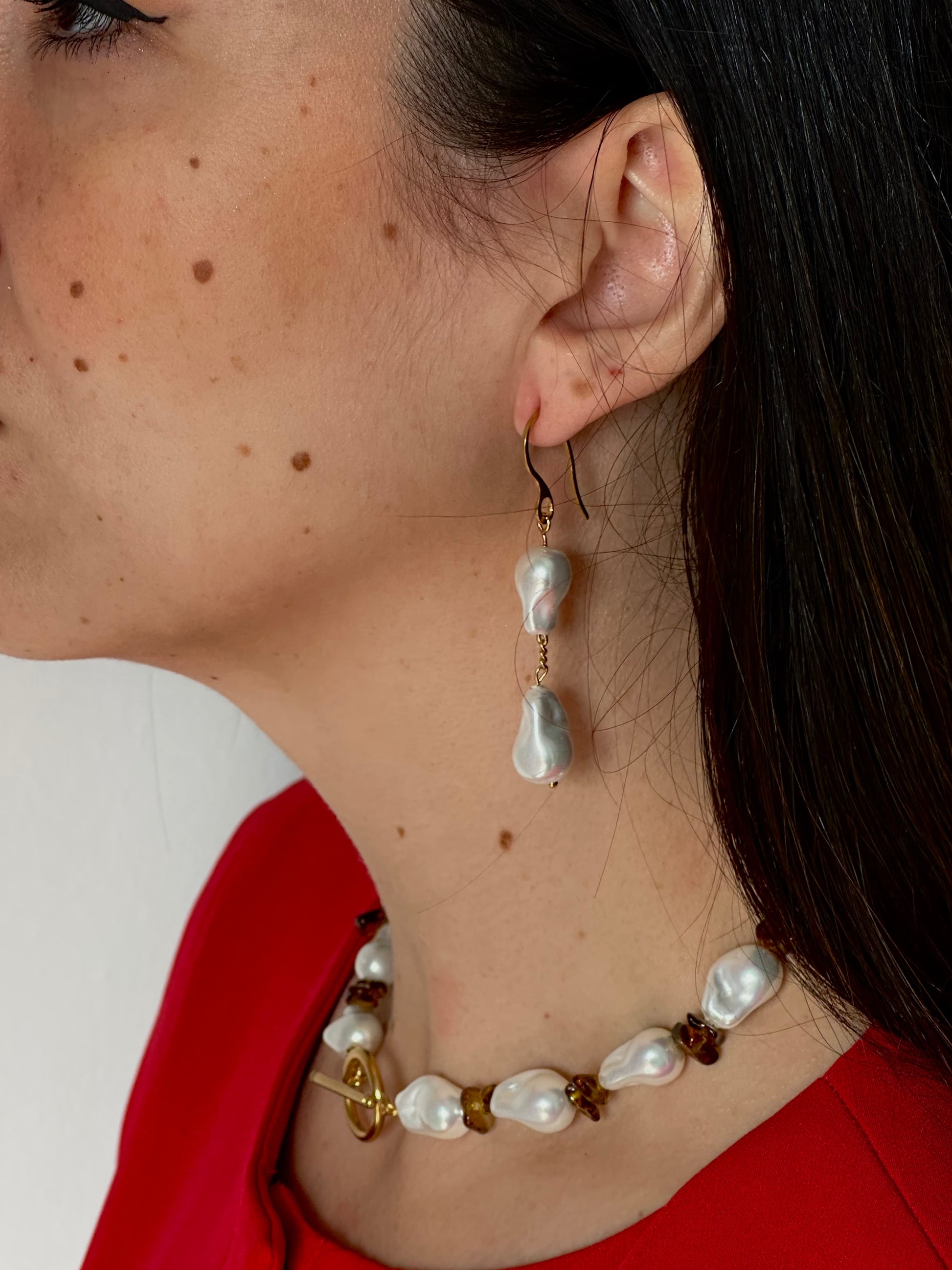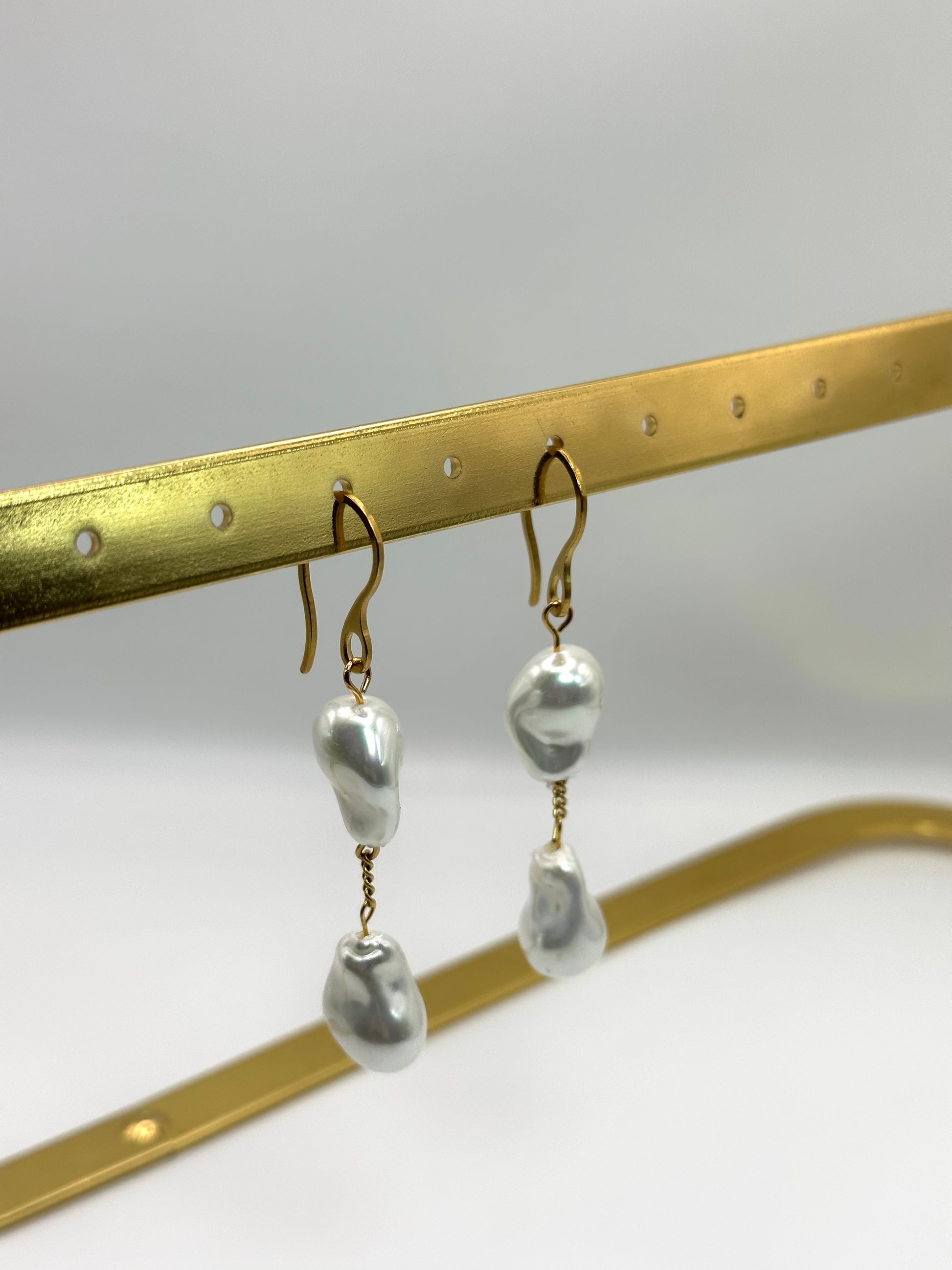 Pendientes hechos a mano con la combinación de cadena de acero inoxidable y perlas naturales.